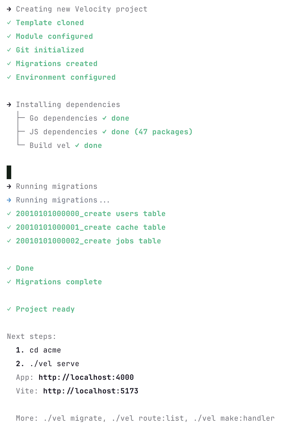 Once you've answered, the installer clones the template, configures the Go module, initializes git, installs dependencies, builds the project-local ./vel binary, runs the initial migrations, and prints the next two commands you need: