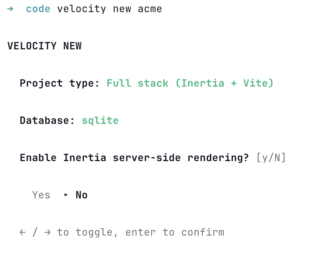velocity new acmeacme is the placeholder name we use throughout these tutorials — pick whatever fits your project.